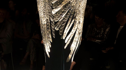 Su punto de partida fue muy cercano: la fundadora de la casa, Elsa Schiaparelli, y su capacidad para reinventarse continuamente. Específicamente, se inspiró en uno de sus looks más memorables: un conjunto con plumas que lució a principios de los años 40, en homenaje a la fallecida bailarina Anna Pavlova y su icónica interpretación del «cisne moribundo». Esta idea de un fénix resurgiendo de las cenizas dio lugar al título de la colección y a varios looks que imitaban el plumaje del ave.