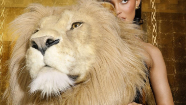 Jenner asistió a la exhibición Otoño/Invierno 2023 con un vestido negro de cuerpo entero, completo con un accesorio poco común. El vestido parece presentar una cabeza de león aparentemente de tamaño natural adherida a él, que aparece en el lado izquierdo del vestido sin tirantes.