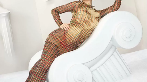 La colección FW24 rinde homenaje a la influencia dinámica de los medios de comunicación, presentando un enfoque moderno y divertido. Las prendas incluyen mezclilla negra y azul, tartán rojo y blanco, los característicos estampados de malla y tejidos invernales acogedores. Uno de los diseños más llamativos es el vestido «Mirè», una pieza de malla translúcida con un audaz estampado de colores icónicos de la marca: azul, magenta, verde y negro, dispuestos en un patrón tipo bola de discoteca. Este diseño también se encuentra en tops de manga larga, faldas y vestidos mini.