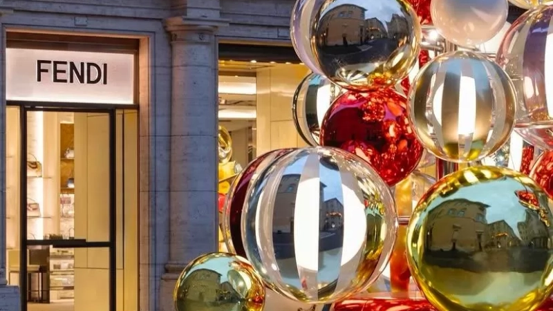 FENDI ha preparado una experiencia navideña única, que fusiona la tradición italiana con la innovación del diseño contemporáneo, para dar la bienvenida a las fiestas y a su centenario en 2025. La firma de lujo ha renovado sus boutiques con escaparates decorados con detalles exclusivos que capturan la esencia festiva de la Maison. El logotipo de FENDI, representado por letras de vidrio burbujeante, se convierte en el protagonista de la celebración, inspirándose en la tradicional artesanía del cristal de Murano. Este logotipo se presenta en tonos metálicos de plata envejecida, azul y rosa empolvado, dando un aire sofisticado y moderno a la decoración.