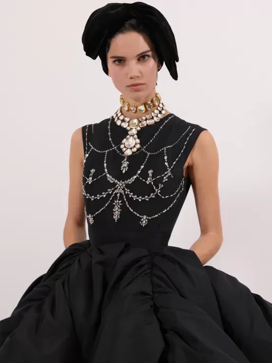 El moodboard de la colección estuvo inspirado por la tranquila belleza de los Jardines Menara en Marrakech, la influencia bohemia de Talitha Getty en los años 60, y la decoración intrincada de los riads palaciegos. Valli aprovechó las técnicas de la alta costura de París para interpretar la riqueza cultural de Marruecos con una precisión inigualable.