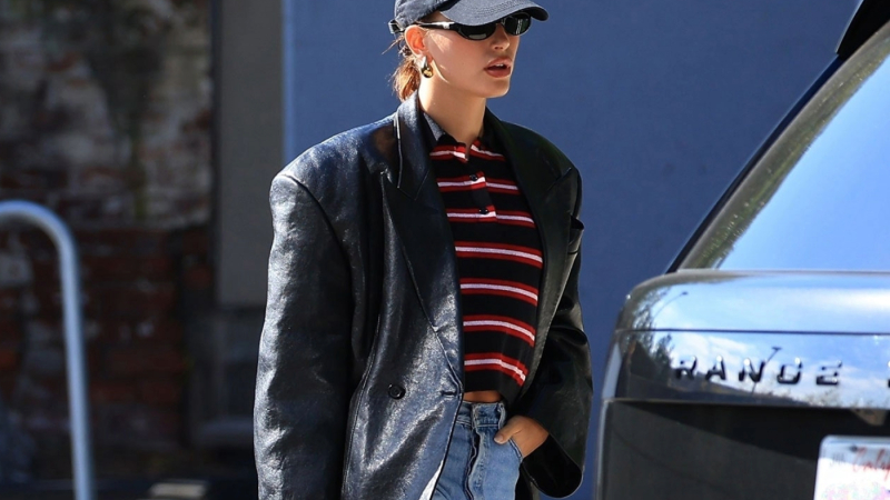 Una vez más, adoptando un elegante look informal que recuerda a la princesa Diana, la modelo y fundadora de Rhode Beauty sorprendió a los observadores durante el fin de semana al elegir jeans que son un cambio respecto a su estilo habitual. Aunque optó por sus clásicos habituales, como un polo corto de Loewe en tonos navy y rojo, una sobrecamisa negra de cuero de Khaite, una gorra de béisbol navy, llamativos pendientes de oro de Bottega Veneta, un bolso tote negro de cuero The Row Idaho y mocasines elegantes, lució un par de jeans azules de tiro alto con una silueta de pierna recta. En ocasiones anteriores, Bieber ha sido vista usando diversas versiones de jeans holgados de marcas como Carhartt, Saks Potts y Martine Rose.