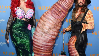 Klum resultó ser un buen partido para su esposo, Tom Kaulitz, quien se vistió como un pescador con su esposa vestida de gusano enganchada a una caña de pesca.