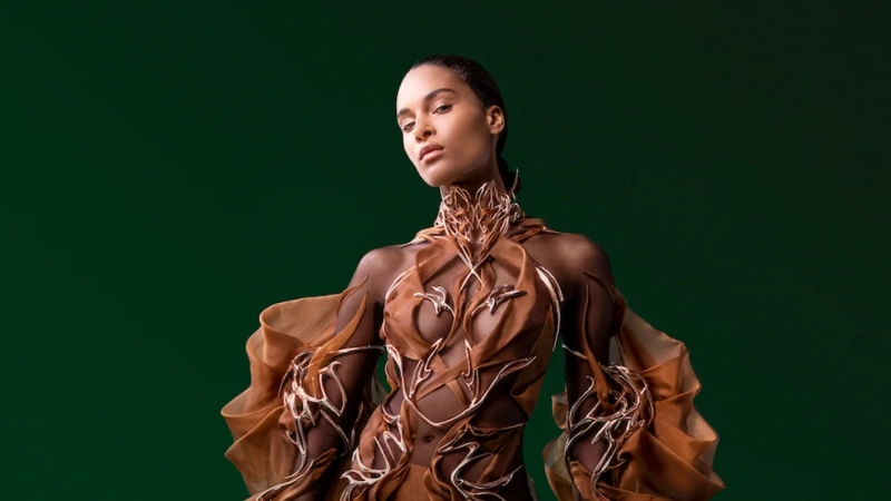 Mostrado en la modelo Cindy Bruna, Van Herpen presentó un atuendo marrón chocolate hecho de cáscaras de granos de cacao, una novedad para un look de alta costura, que se convirtió en fibras de biopolímero con la ayuda de la impresión 3D.