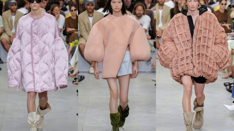 El lugar del desfile se transformó en un acogedor refugio nocturno, con bombillas titilantes y telas mullidas. La colección que siguió reflejaba estos motivos, incluyendo abrigos acolchados, chaquetas de edredón en tonos crema y rosa, y bombers de gran tamaño.