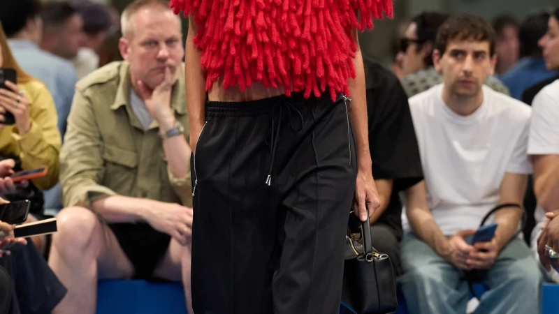 Durante el desfile pudimos ver camisetas de rugby (parte de la infancia de Anderson) que se reforzaron con caderas estilo chaqueta de bar y se presentaron en punto o jersey rígido. Las sudaderas, de punto fino, venían con muescas en V de gran tamaño que luego se recortaban. Algunos looks fueron tejidos en un tejido de nobly inspirado en el sofá de los años 70 en la oficina de Anderson. Pantalones cortos de colegiala con una pernera extra ancha. Suéteres y vestidos de punto que venían con dos refuerzos, paneles de punto rellenos que serpentean diagonalmente en la parte delantera del torso como las cestas en espiral caseras en las que se inspiró a Anderson. Había zapatos de punto encerados y ropa de punto encerada en una malla que se parecía vagamente a las bolsas de frutas y a las bolsas de compras plegables de la vieja escuela.