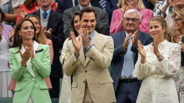 Middleton es patrona del All England Tennis Club; llevaba un lazo morado para señalar su papel. Tomó asiento en el palco real de la cancha central junto a la leyenda del tenis suizo, Roger Federer.
