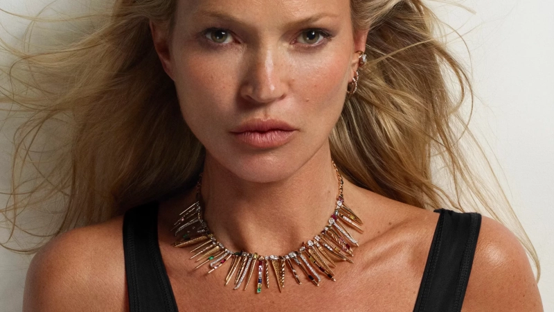La supermodelo británica protagoniza la última campaña de la firma de joyería Kismet by Milka, luciendo la versión más exclusiva del collar Confetti, ahora enriquecido con diamantes, rubíes, esmeraldas y zafiros en tonalidades que van del rosa al azul marino.