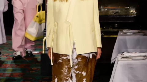 La sastrería llega con contraste. La estructura italiana se encuentra con la energía punk a través de chaquetas de cena rosa fuerte y forros con monogramas, mientras que la sastrería japonesa adquiere un nuevo significado en prendas de satén para la noche. La ropa de trabajo hace un guiño a la forma militar pero se desplaza a un nuevo territorio con botones de perlas, piel sintética y color. Una camisa de chef con estampado de rosas y pantalones redondeados anclan la silueta en la historia de Kenzo Takada pero evitan la nostalgia.