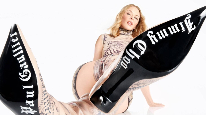 Kylie Minogue brilla en la audaz colaboración entre Jean Paul Gaultier y Jimmy Choo, fusionando moda y glamour.