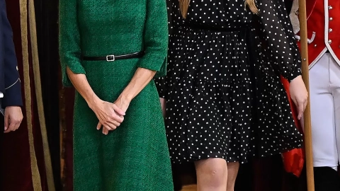 Para esta cita clave, Sofía recurrió a un diseño de Carolina Herrera, una firma habitual en el armario de la reina Letizia. El vestido escogido fue una pieza de seda con estampado de lunares en blanco y negro, adaptado para ella a un largo más juvenil, que combinó con una capa de lana negra para exterior y unos slingbacks de cuero firmados por Magrit, todo en sintonía con las tendencias actuales y con una clara identidad española.