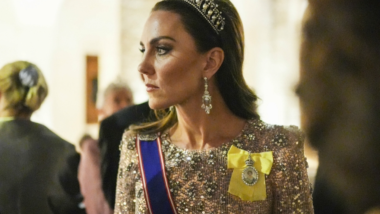 Una vez más, the royal lució la tiara Lover’s Knot, a menudo citada como una de las favoritas de Diana, Princesa de Gales, y usada con frecuencia por Kate cuando adopta su rol de princesa por completo. En cuanto a sus pendientes de diamantes, pertenecieron anteriormente a la Reina Isabel II, quien los recibió como regalo de bodas de sus padres, el Rey Jorge VI y la Reina Isabel. Ambas piezas fueron diseñadas en la década de 1910: la tiara por Garrard y los pendientes por Cartier, pero Kate, como siempre, encontró la manera de hacer que parecieran atemporales.