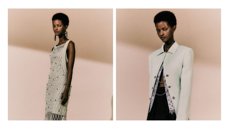 El encaje y los uniformes a rayas se transforman con guantes de látex y un toque futurista, mientras que las flores abstractas florecen en camisas estructuradas y blazers. Los detalles de bordados evocan la elegancia intrincada de LANVIN, presentando una colección refinada en encantadores tonos pastel.