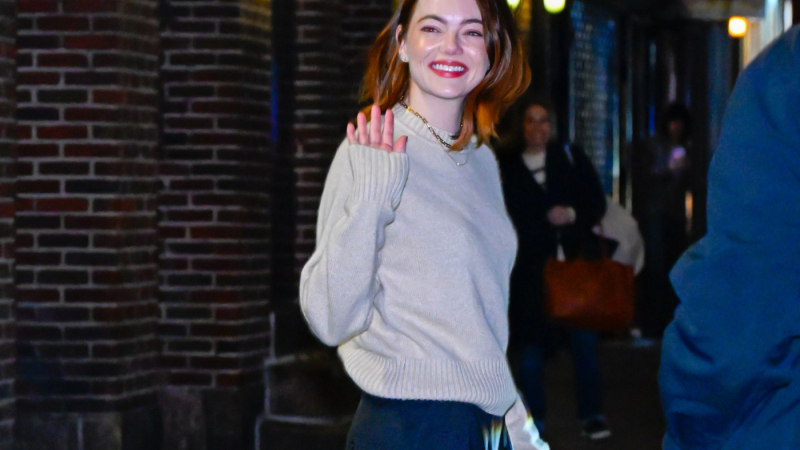 Para su participación en The Late Show with Stephen Colbert en Nueva York, la protagonista de Poor Things combinó sus mocasines rojo cereza, de la marca de lujo favorita de todas las celebridades minimalistas, The Row, con pantalones plisados en azul marino que tenían una elegante silueta de tubo. Stone completó el look con un sencillo suéter beige de cuello redondo y un delicado collar de cadena dorada. La fórmula de moda de Emma aquí es sencilla: hacer que el conjunto sea limpio y atemporal, pero agregar un toque de rojo para mantener las cosas actuales.