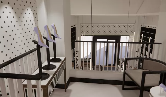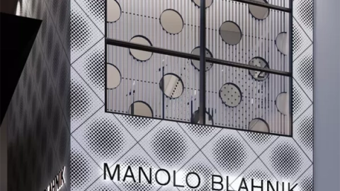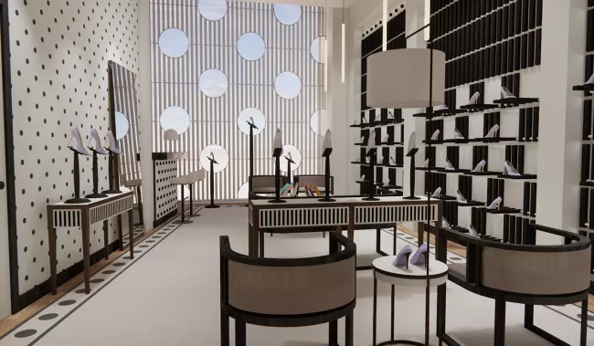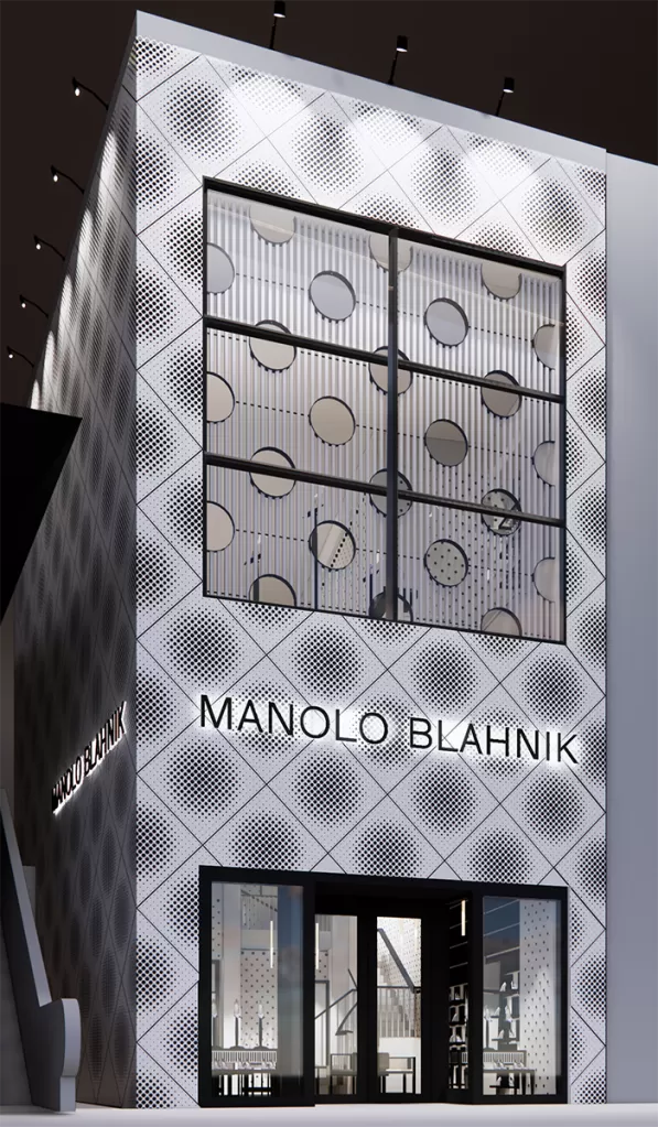 La boutique, de 184 metros cuadrados, refleja la elegancia y el estilo característico de Blahnik. La fachada geométrica y los detalles de interiores, como alfombras y papeles pintados con su icónico estampado de lunares, crean un espacio sofisticado. Además, el diseño de la tienda permite una presentación dinámica de las colecciones gracias a estanterías flotantes personalizables.