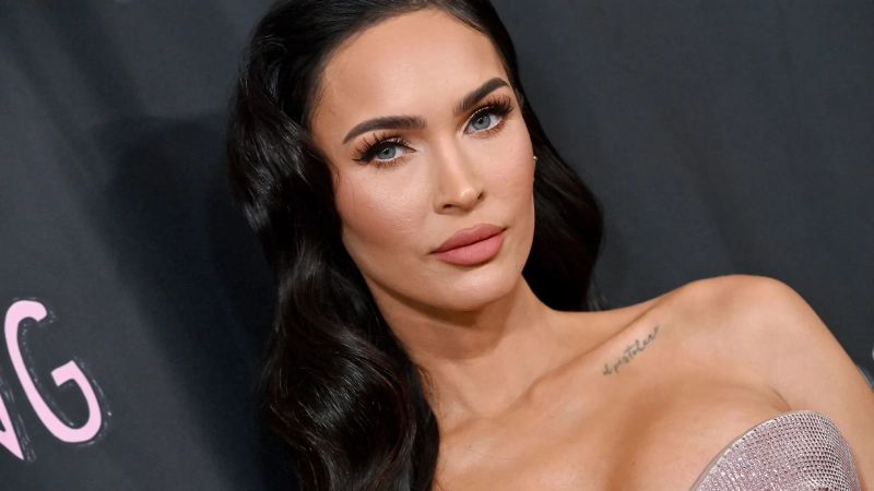 Megan posó para una foto de Instagram, en la que aparecía abrazada a Machine Gun Kelly, con un vestido negro sin tirantes. El diseño de Zuhair Murad tenía un corsé de cuentas con una falda larga hasta el suelo. Las aberturas hasta los muslos estaban a ambos lados de la parte inferior del vestido.