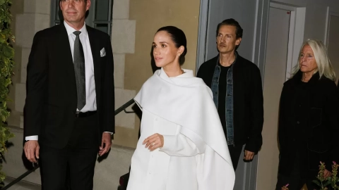 La duquesa de Sussex llegó cuando todos los invitados ya estaban sentados, acaparando todas las miradas con un conjunto blanco impecable: camisa sedosa, pantalón a juego y una capa larga que envolvía sus hombros con elegancia minimalista. Completó el estilismo con salones negros en punta y un clutch del mismo tono. Su maquillaje fue discreto, en sintonía con el look, y llevó el cabello recogido en un moño pulido.