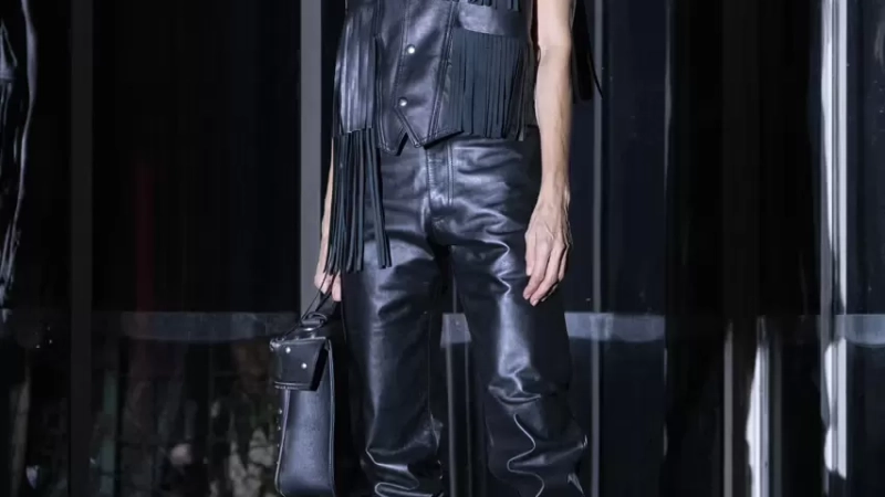 La colección FW25 presentó una paleta de negros en diversas tonalidades con destellos de burdeos, morados y azules, desdibujando las fronteras entre la sastrería masculina tradicional y acabados femeninos inesperados. Accesorios como guantes modulares y cascos de motocicleta se combinaron con trajes de lurex brillante y conjuntos con reflejos cambiantes, creando una provocación sutil que desafía las convenciones de género.