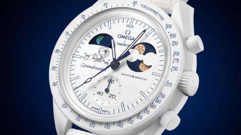 El diseño se completa con una complicación de fase lunar en el subdial de las dos en punto, donde destacan dos lunas llenas bañadas en Moonshine Gold, el exclusivo oro desarrollado por OMEGA. Una de ellas está ilustrada al estilo de Snoopy, mientras que la otra muestra un motivo de copo de nieve. Cada copo ha sido grabado con láser de forma individual, por lo que no existen dos relojes exactamente iguales, un guiño a la singularidad natural que pretende transmitir la pieza.