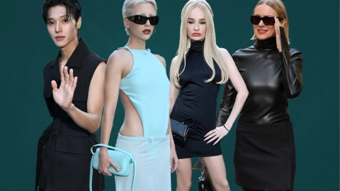 El idol surcoreano Wooyoung, integrante del grupo ATEEZ, optó por un conjunto sastrero también en negro, demostrando cómo el tailoring continúa siendo una de las apuestas más versátiles del menswear contemporáneo. En contraste, Emma Chamberlain brilló con un conjunto en color celeste, compuesto por un body, una falda translúcida y complementos a tono que reafirmaron su audacia estética.