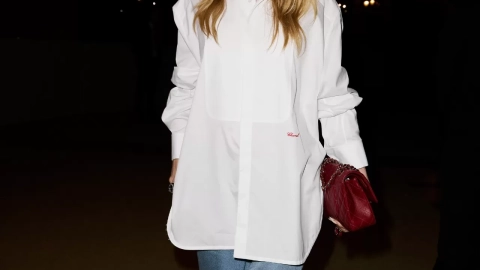 La actriz, ganadora del Óscar, acudió al desfile con un look relajado pero estratégico: una camisa masculina blanca de estilo esmoquin, sobredimensionada, combinada con vaqueros amplios. El conjunto sirvió como introducción estética a la nueva etapa creativa de la maison, que ahora se abre a una lectura más contemporánea del lujo.