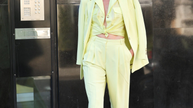 Nieves con un traje de BOSS en color amarillo limón de solapas en pico y pantalón de pinzas combinado con una blusa en el mismo tono de la actual colección Pre-Fall 2022.