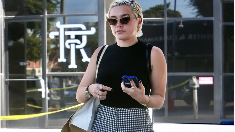 En términos generales, esta es la fórmula de Florence Pugh: vestirse con un atuendo común (ese top sin mangas, un par de pantalones a cuadros cortos) y luego combinarlo con zapatos y gafas de sol inusuales. Como, por ejemplo, las gafas al estilo John Lennon y las enormes cuñas de brocado que llevó en septiembre. Todo gira en torno a la feminidad intencionadamente peculiar. El peinado al estilo Guy Fieri combinado con el bolso Valentino Rockstud. ¡Una exhibición «ELEGANTE» en verdad!