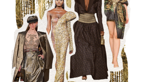 Siluetas lujosas adornadas con bordados de lentejuelas, texturas metálicas y estampados botánicos definen la estética de la colección. Una rica paleta de colores en dorado, negro y gris crea una cautivadora sinfonía de elegancia audaz, invitando a los que la llevan a sumergirse en un mundo donde la tradición se encuentra con el encanto.