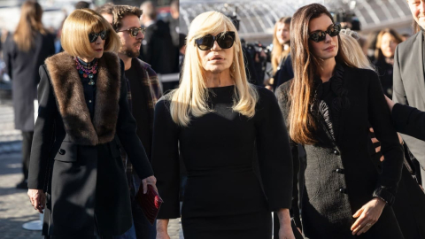 Donatella Versace llegó fiel a su imagen reconocible, con un vestido negro ceñido, botas altas y gafas de sol XL. Incluso en el luto, su presencia fue poderosa, subrayando el respeto mutuo entre dos grandes nombres de la moda italiana, unidos por una historia compartida de creatividad y rivalidad admirativa.