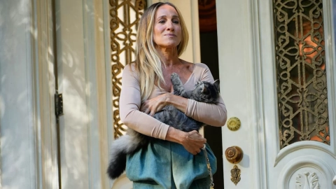 En la parte superior, SJP llevaba un top nude de manga larga de Donna Karan New York con cuello en V y unos zapatos blancos estilo Mary Jane, también de Maison Margiela. En sus orejas, unos pendientes de perlas. Parker estaba siendo filmada frente a su nueva casa ficticia y sostenía a la estrella animal del show, interpretada por el gato real de Parker, que se llama Lotus en la vida real. El pequeño Lotus fue adoptado por la protagonista de SATC y su esposo Matthew Broderick en abril de 2023.