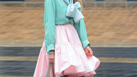 Después de su paso por Londres para la temporada en The Savoy Theatre, donde su estilo recordaba a Miranda de los años 90, Parker vuelve al set con un look más acorde a su personaje, con tonos pastel y accesorios llamativos.