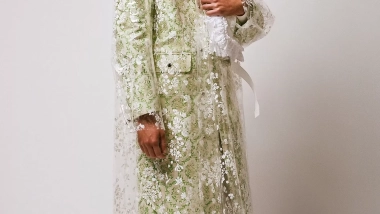 La colección, que debutó parcialmente en la pasada London Fashion Week, amplía su imaginario teatral en clave masculina: blazers cruzados con fajas plisadas, trenchs y abrigos jacquard, polos con volantes superpuestos, camisas tipo bowling reinterpretadas con bordados y aplicaciones de gemas. Los pantalones de sastrería y el denim sobredimensionado aportan equilibrio estructural frente a una ornamentación que no teme al exceso.