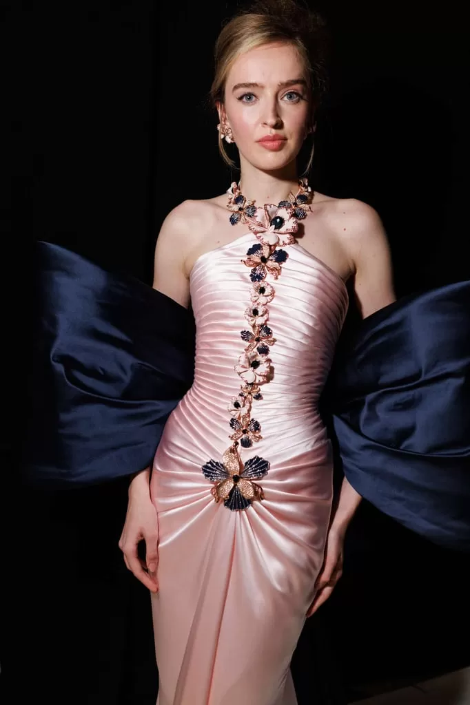 La colección destacó por el uso de colores como el rosa chicle, azul celeste y verde menta, aplicados en vestidos de satén. Los detalles de plumas y apliques florales añadieron una dimensión romántica, mientras que las siluetas estructuradas equilibraban la dulzura con una dosis de modernidad.