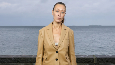 Vistiendo un sujetador de macramé y una chaqueta beige corta, combinada con una falda azul de lentejuelas sobre jeans y sandalias, el look de Alana Hadid reflejó el enfoque ecléctico para vestir que se ha visto en la moda escandinava en las últimas temporadas. De hecho, fácilmente se podría imaginar que varias de las prendas de Saks Potts podrían ser usadas por las hermanas menores del modelo (ambas fanáticas de la marca), incluyendo las camisetas de polo a rayas y un par de jorts.