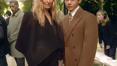 Entre los asistentes más comentados estuvo V de BTS (Kim Taehyung), quien acudió al show con un abrigo camel de doble botonadura, camisa blanca impoluta y una corbata con estampado sutil. El cantante coreano consolidó su posición como embajador global de estilo, optando por un look que podría definirse como “modern gentleman”: elegante, sobrio y ejecutado con precisión sartorial. Su presencia no pasó desapercibida y volvió a posicionar a CELINE como una marca querida por la élite artística asiática.