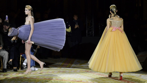 Con menos de una hora de creatividad sin precedentes y una calidad sin concesiones, con solo 18 looks -aproximadamente la mitad que la mayoría de sus homólogos de la Semana de la Costura-, la casa de moda holandesa hizo girar las cabezas con una pasarela de vestidos invertidos y horizontales.