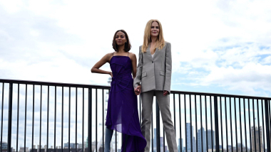 Saldaña llevaba un vestido de seda color morado intenso de VB, con delicados tirantes, un dobladillo asimétrico y detalles de rosas en la cadera derecha. Combinó el vestido con las botas peep-toe por encima de la rodilla del diseñador en un tono azul apagado.