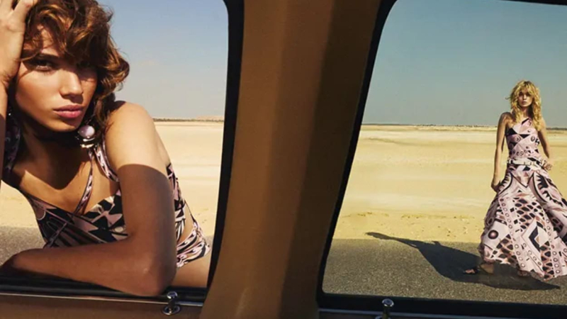 Los icónicos estampados Vivara, Orchidee y Labirinti mantienen el lenguaje gráfico característico de la casa, adaptándolo a un entorno minimalista que potencia su intensidad visual. Joyas escultóricas y sandalias elevadas completan la propuesta, acentuando la verticalidad de las figuras frente al paisaje abierto.